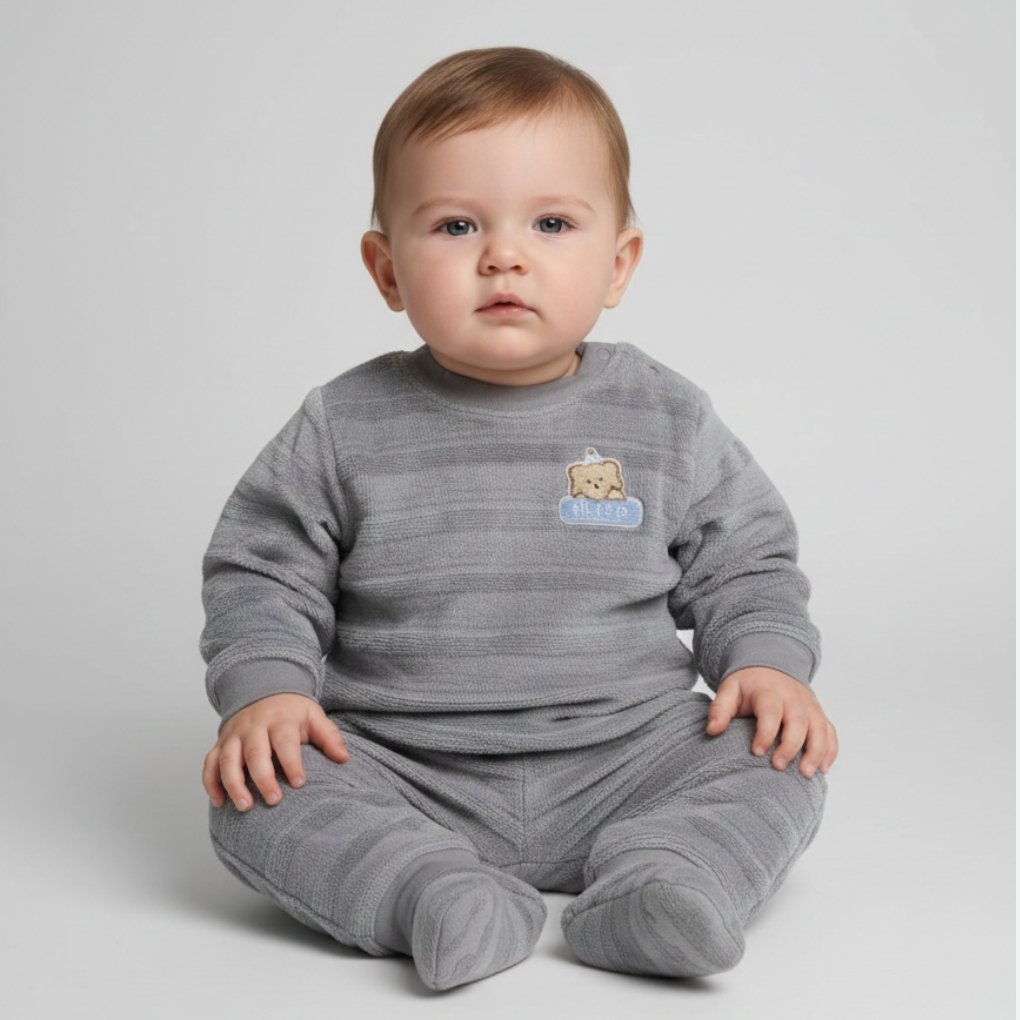 طقم ملابس بيبي مكوّن من قطعتين، ناعم ودافئ، بتصميم بسيط ولطيف يناسب الاستخدام اليومي.